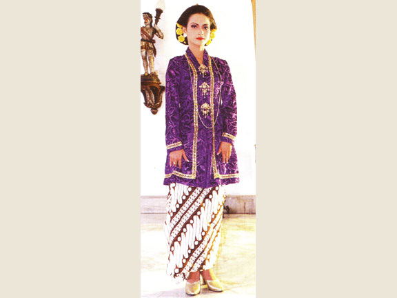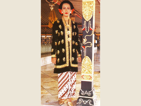 Memakai kain batik wiron dan memakai kebaya beludru/sutra panjang dengan pelisir pita emas dan memakai peniti susun tiga |